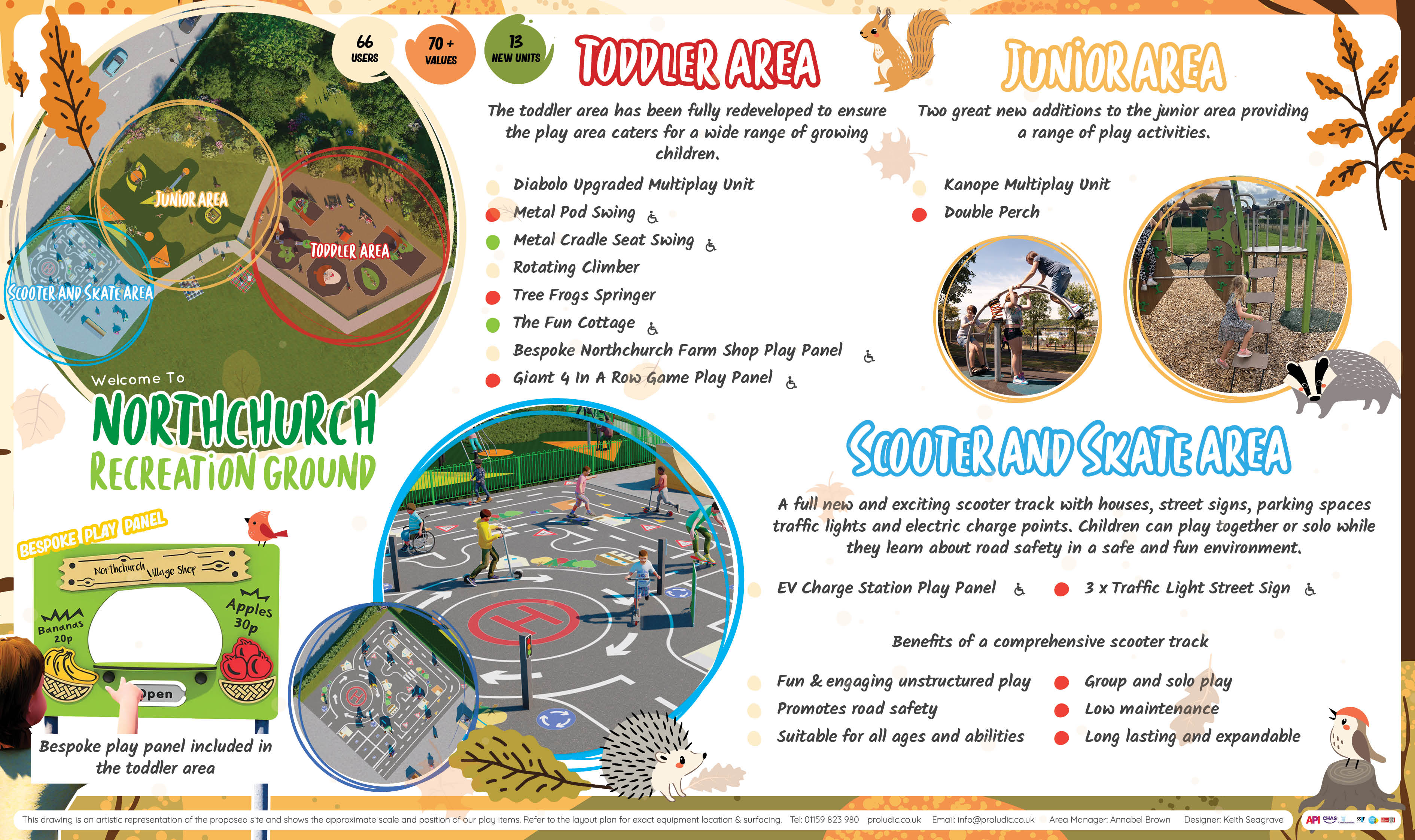 - The new equipment from 2 years ago will remain but the medium climbing frame near the skate ramp will be relocated to the toddler area and enhanced. The gap will be filled in with a springer